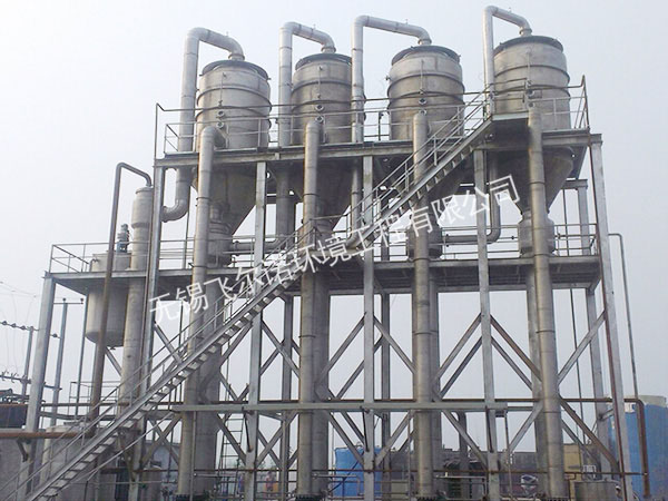 多效強制循環蒸發器由各效蒸發器、各效分離器、冷凝器、循環泵、效間泵、真空及排水系統、分汽缸、操作平臺、電器儀表控制柜及閥門、管路等系統組成。